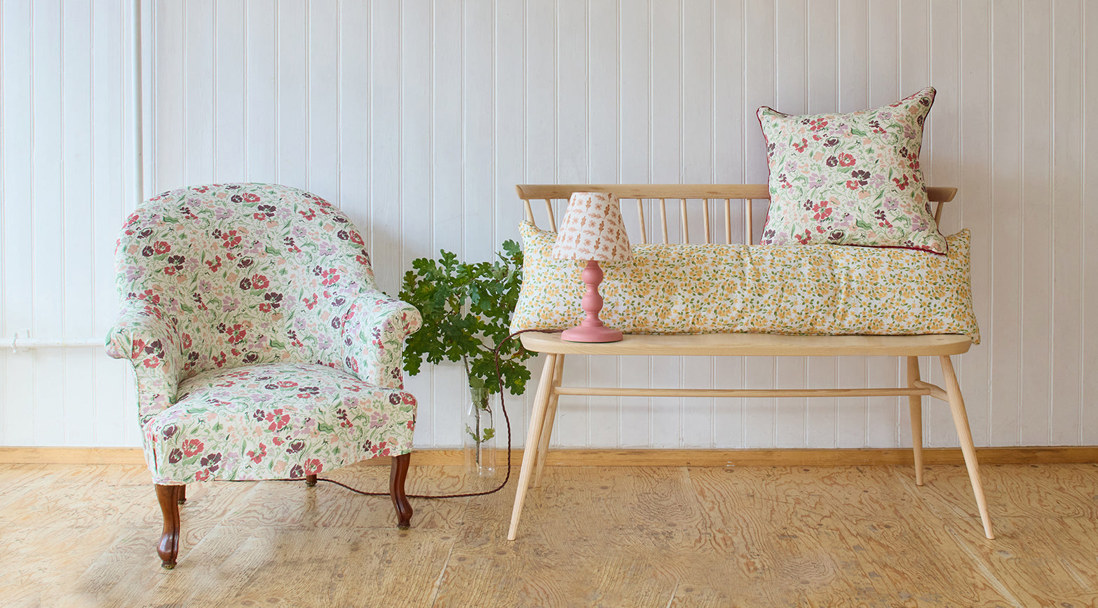 Pure linen cloth and wallpapers in original hand~painted prints by artist Sophie Harpley.